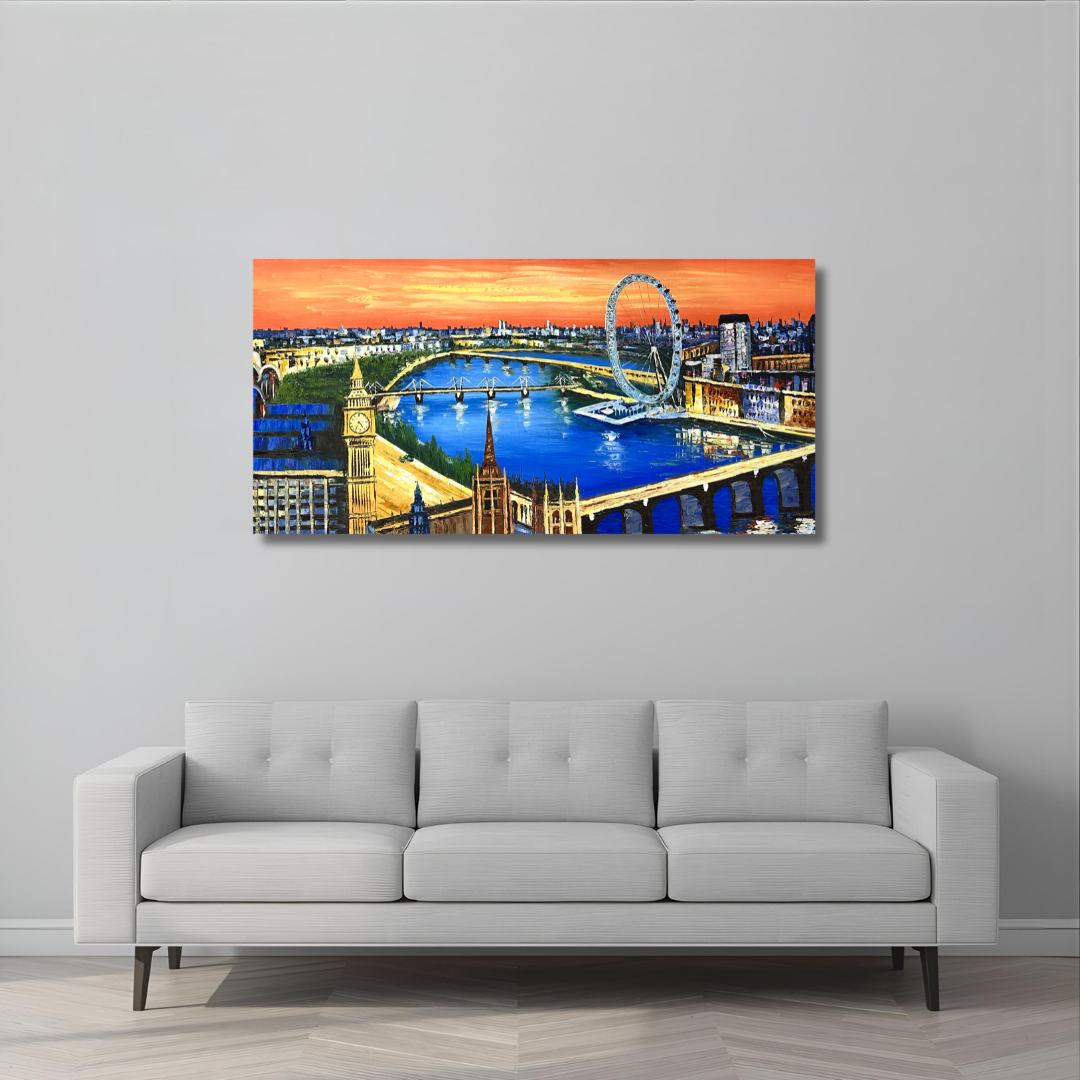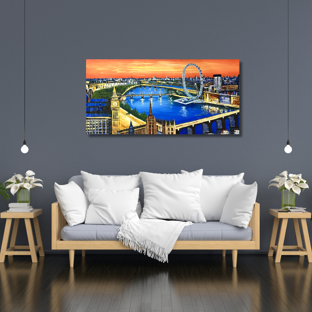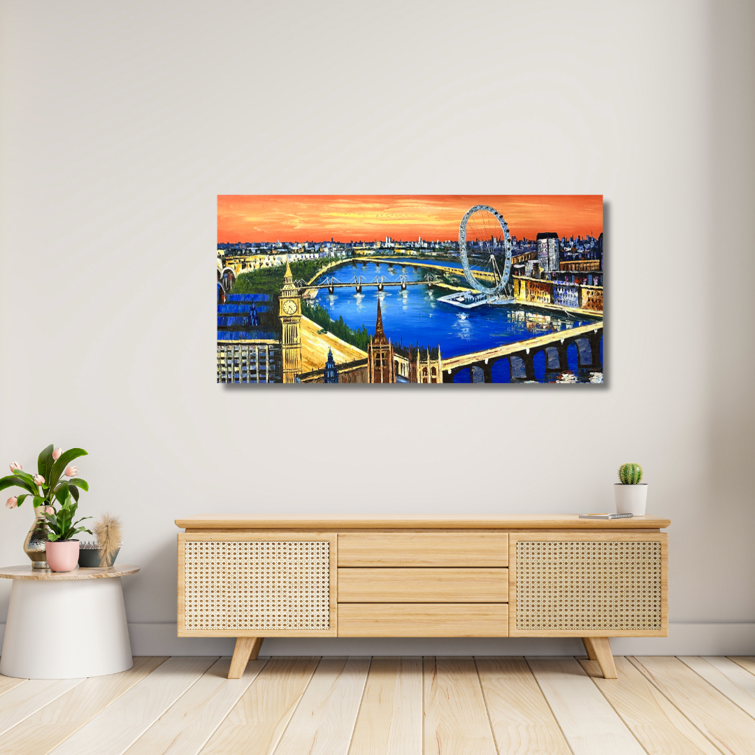 This London Painting is a perfect panoramic view of London. Iconic landmarks of Big Ben, London Eye, Westminster Bridge, Millennium Bridge can be easily seen in the painting.