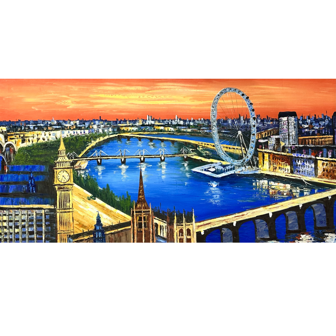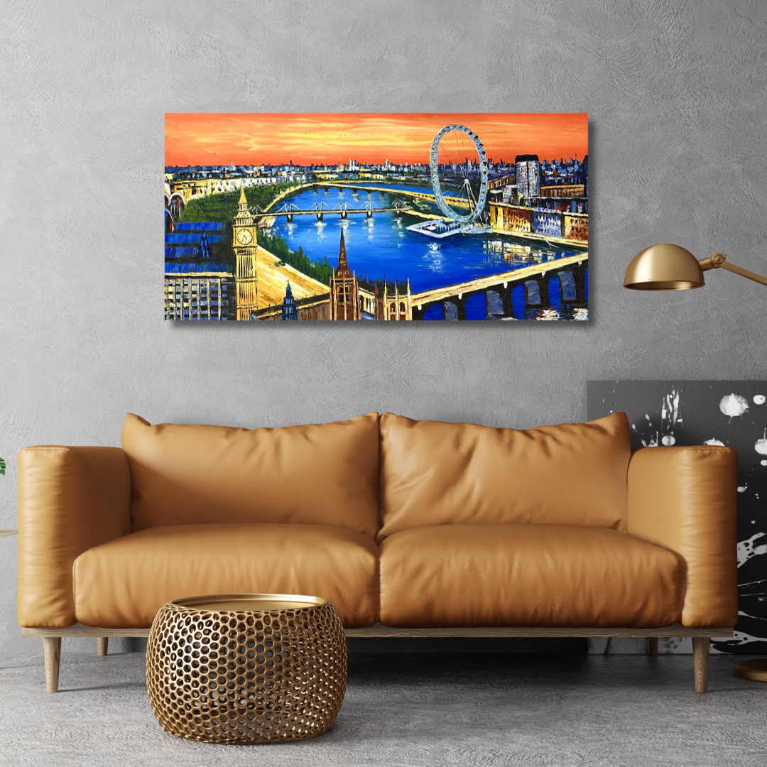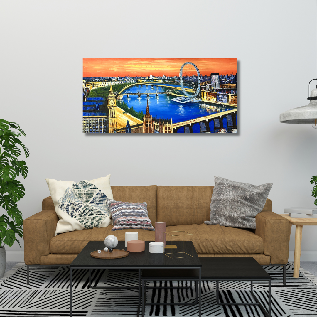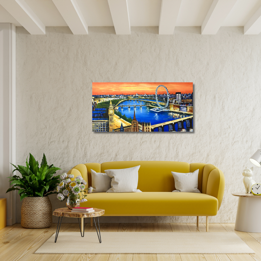 This London Painting is a perfect panoramic view of London. Iconic landmarks of Big Ben, London Eye, Westminster Bridge, Millennium Bridge can be easily seen in the painting.