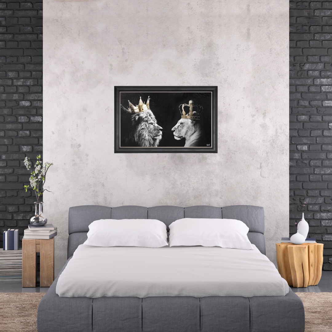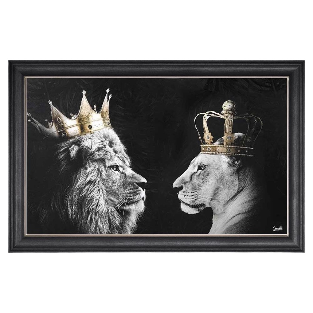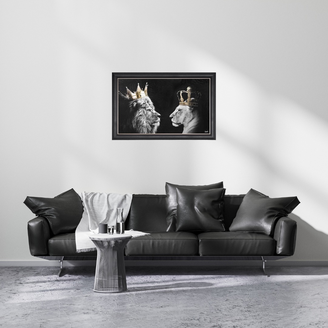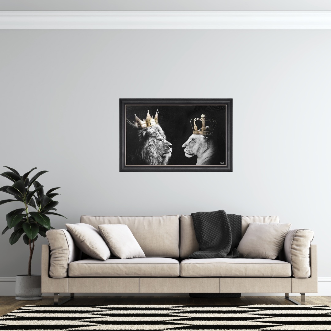 Lion King and Lioness Queen of the Jungle Artwork. Framed Wall Art, with hand-embellished crystal touches and paint on top of the glass.